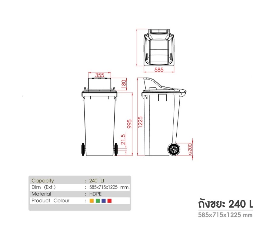 ขนาด 590x715x11225 มม. มี 4 สี เขียว เหลือง แดง น้ำเงิน  เกรด HDPE